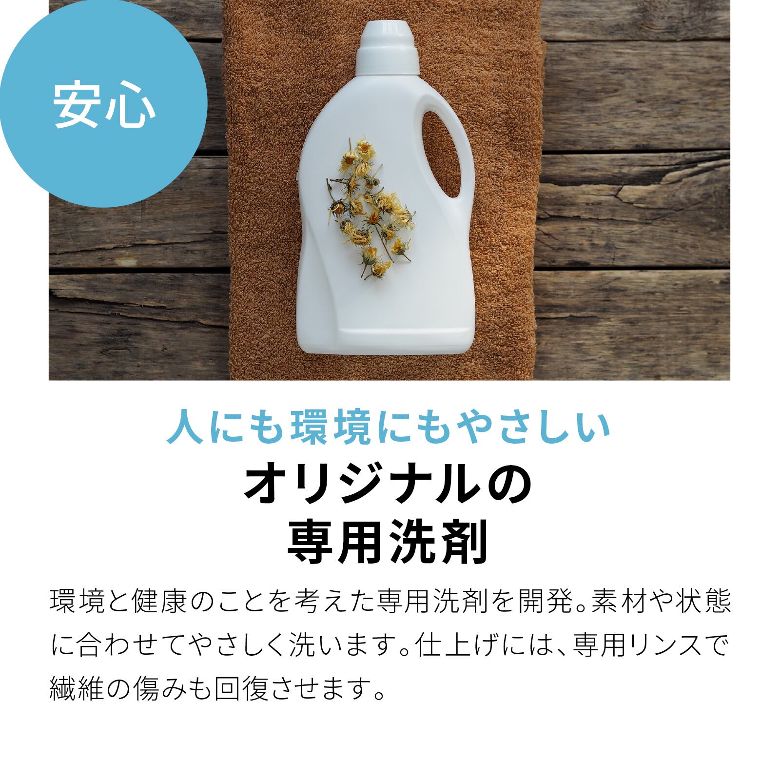 環境と健康のことを考えたふとん専用洗剤を開発。ふとんの素材や状態に合わせてやさしく洗います。仕上げには、ふとん専用リンスで繊維の傷みも回復させます。