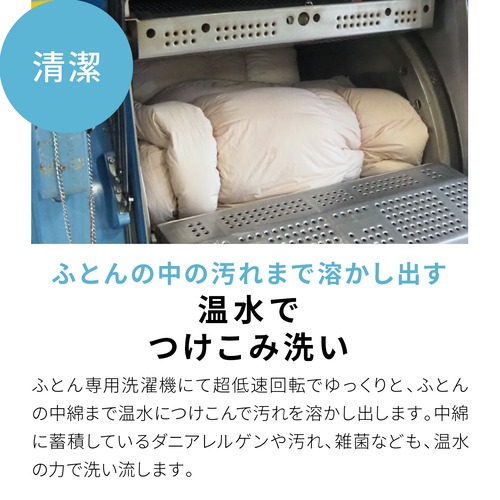ふとん専用洗濯機にて超低速回転でゆっくりと、ふとんの中綿まで温水につけこんで汚れを溶かし出します。中綿に蓄積しているダニアレルゲンや汚れ、雑菌なども、温水の力で洗い流します。ふとんが傷むのを防ぐため、激しくもんだりたたいたりといった力は加えません。